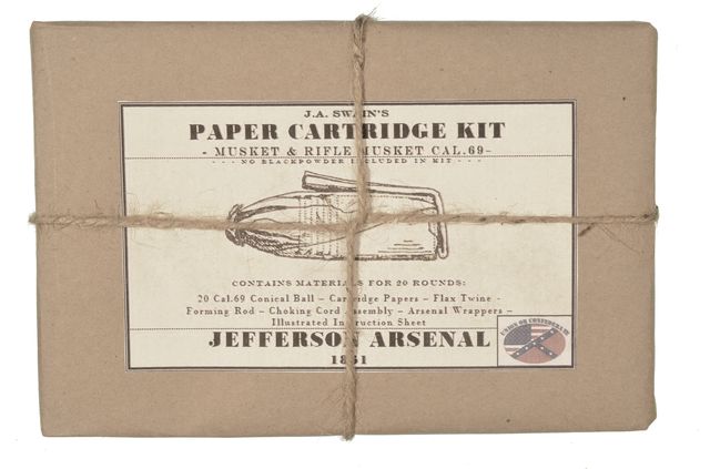 CIVIL WAR .69 CALIBER MINIE TRADITIONAL PAPER CARTRIDGE KIT. Based on original arsenal guidelines, this kit contains everything needed (Except The Powder) to roll your own Civil War Cartridges. Kit includes 20 lubricated .69 Minie Balls, correct paper, twine, forming dowel, choking cord assembly, and rappers. Cartridges can be packed into arsenal correct 10 round wrappers (Included). A detailed instruction manual guides you through assembly and provides insight into this historical process. A great way to add authenticity to your blackpowder shooting, Reproduction.