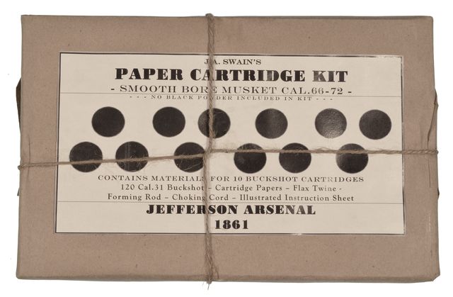 CIVIL WAR .66 - .72 CALIBER BUCKSHOT TRADITIONAL PAPER CARTRIDGE KIT. Based on original arsenal guidelines, this kit contains everything needed (Except The Powder) to roll your own Civil War Cartridges. Includes components for 10 cartridges. Kit includes 120 .31 Cal roundballs, correct paper, twine, forming dowel, choking cord assembly, and rappers. Cartridges can be packed into arsenal correct wrappers (Included). A detailed instruction manual guides you through assembly and provides insight into this historical process. A great way to add authenticity to your blackpowder shooting, Reproduction.