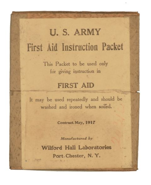 WWI U.S. ARMY FIRST AID INSTRUCTION PACKET. Cardboard Container Measures 2 1/2"x3 3/4" X 4 3/4" High. Label Dated May 1917, Wilford Laboratories, Port Chester, NY. Contains 2 Compression Bandages With Cloth Securing Strips. Instructions For Use Printed On Reverse Label, Original.