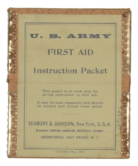 WWI U.S. ARMY FIRST AID INSTRUCTION PACKET. Cardboard Container Measures 2 1/2"x3 3/4" X 4 3/4" High. Label Reads Seabury & Johnson, New York, NY USA. Contract May 1917. Contains 2 Compression Bandages With Cloth Securing Strips. Instructions For Use Printed On Reverse Label, Original.