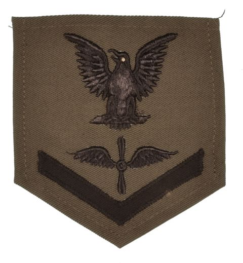 AVIATION MACHINIST MATE, 3rd CLASS. Eagle with winged prop & 1 stripe. Dark gray twill with stripes & specialty mark embroidered in dark blue. WW2 dates hand stitched on reverse side. Mint, Original.
