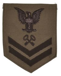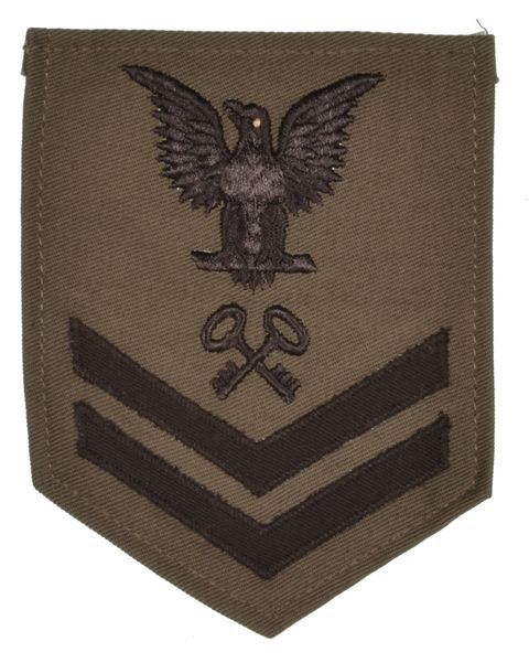 STOREKEEPER, 2nd CLASS. Eagle with crossed keys & 2 stripes. Dark gray twill with stripes & specialty mark embroidered in dark blue. WW2 dates hand stitched on reverse side. Mint, Original.