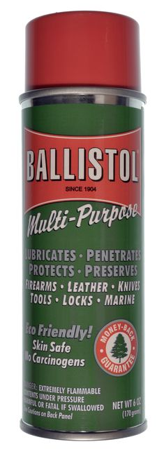 6 Oz BALLISTOL AEROSOL. Ballistol can be used to lubricate, penetrate, clean, protect, and preserve firearms, leather, knives, marine equipment, fishing gear, tools, locks, wood, metal, rubber, and so much more. Perfect size for your shooting/toolbox.