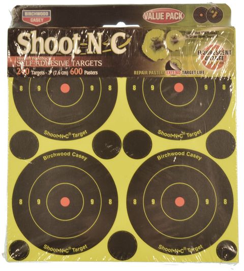 SHOOT-N-C 3" TARGET, Birchwood Casey Shoot N C Target reveals bullet holes with bright chartreuse rings. Peel and stick targets are easy to put up and include repair dots for reuse. Pack of 240 targets and 600 repair dots.