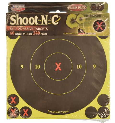 SHOOT-N-C 6" TARGET, Birchwood Casey Shoot N C Target reveals bullet holes with bright chartreuse rings. Peel and stick targets are easy to put up and include repair dots for reuse. Pack of 60 targets and 240 repair dots.