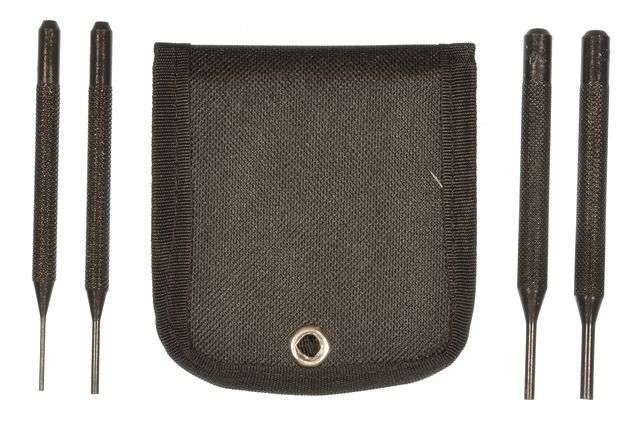STEEL PIN PUNCH SET, 4 piece set. Each punch is 4 inches long with a knurled handle. Includes 1/16", 3/32", 1/8", and 5/32" punches with carrying case.