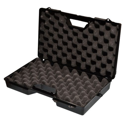 HARD SHELL PISTOL CASE. Black plastic with egg crate foam lined compartment. 14" Inside.