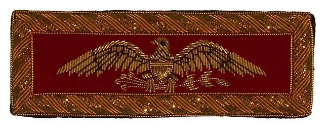 COLONEL ARTILLERY, Silver Eagle, Scarlet Field. Shoulder straps have borders embroidered in gold bullion. Center designs are in gold or silver per regulations. Price is per pair, Reproduction.