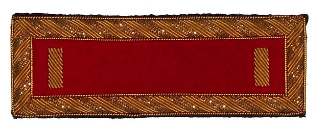 1st LIEUTENANT ARTILLERY, 1 Bar, Scarlet Field. Shoulder straps have borders embroidered in gold bullion. Center designs are in gold or silver per regulations. Price is per pair, Reproduction.