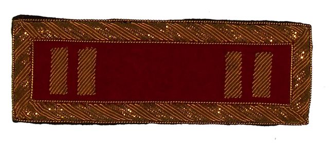 CAPTAIN ARTILLERY, 2 Bars, Scarlet Field. Shoulder straps have borders embroidered in gold bullion. Center designs are in gold or silver per regulations. Price is per pair, Reproduction.