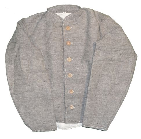 C.S. ATLANTA DEPOT JACKET. Salt & pepper gray wool jean cloth. Complete with wood buttons, Reproduction.