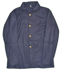 CIVIL WAR 4 BUTTON SACK COAT. Blue Wool Unlined. 4 button front, fold down collar. Please specify size when ordering, Reproduction.
