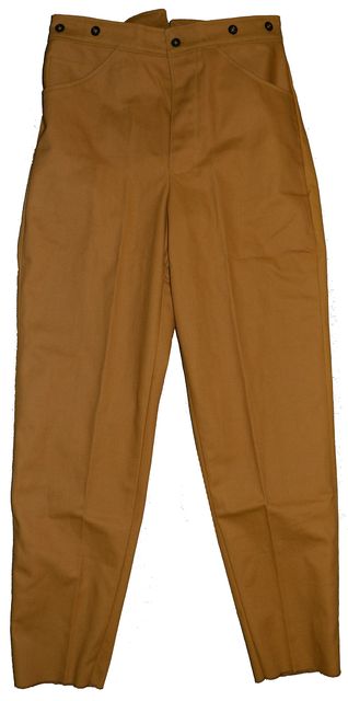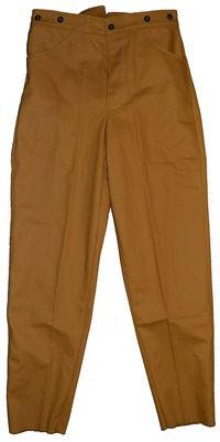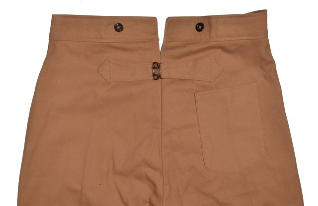 1884 TROUSERS, Tan cotton with blackened buttons. Adjusting strap and buckle on back just below waist. Suitable for Cavalry. Specify size when ordering, Reproduction.