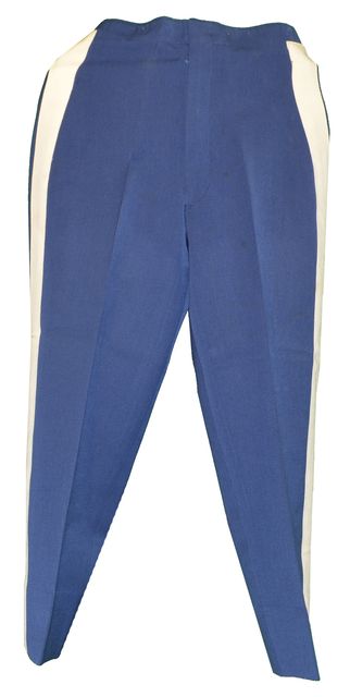 1960’S ROTC OR BAND UNIFORM TROUSERS, Sized about youth Medium. Blue with 1 ½ inch white stripes. Made by famous supplier JACOB REEDS SONS Pennsylvania. Very High Quality. Wool Material, Original.