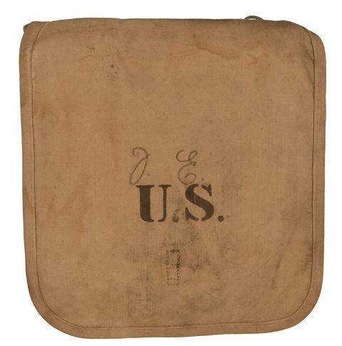 INDIAN WAR HAVERSACK, Approximately 11.5" x 11.5". Old Bannerman Island Stock. May have small rips, stains, or marks. Hardware and Straps are worn. Marked U.S. with 3H US 36 on inside flap, Original.