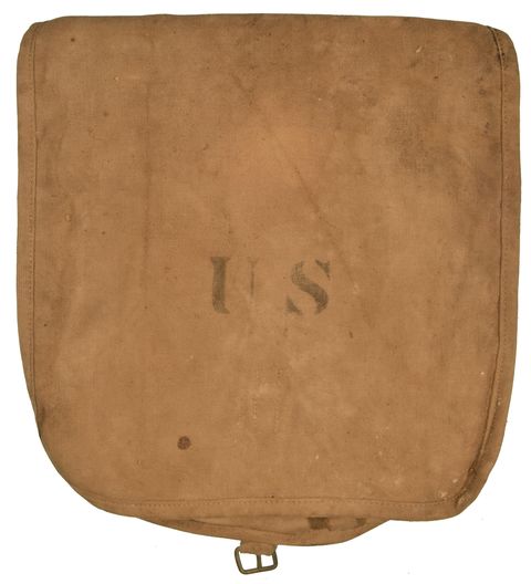 INDIAN WAR HAVERSACK, Approximately 11.5" x 11.5". Old Bannerman Island Stock. May have small rips, stains, or marks. Hardware and Straps are worn. Marked U.S., Original.