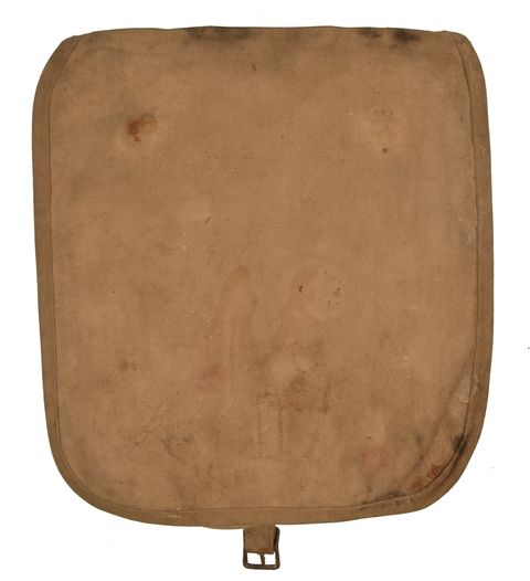 INDIAN WAR HAVERSACK, Approximately 11.5" x 11.5". Old Bannerman Island Stock. May have small rips, stains, or marks. Hardware and Straps are worn. Faded Markings, Open Seems, Original.