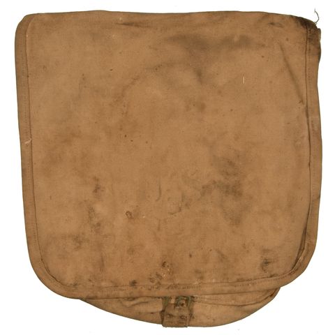 INDIAN WAR HAVERSACK, Approximately 11.5" x 11.5". Old Bannerman Island Stock. May have small rips, stains, or marks. Hardware and Straps are worn. Marked U.S., Faded, Original.