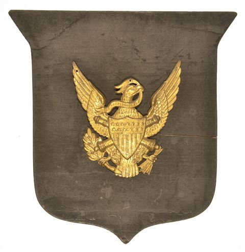 BANNERMAN PLAQUE, Historic Decorative Office/Den Wall Plaque manufactured and sold by legendary military surplus dealer Francis Bannerman. Each plaque is one of a kind with various original and reproduction insignia. 1930's-1940's era manufacture.