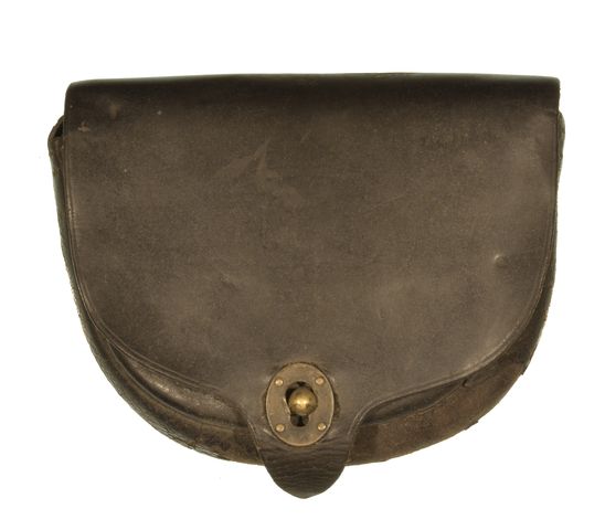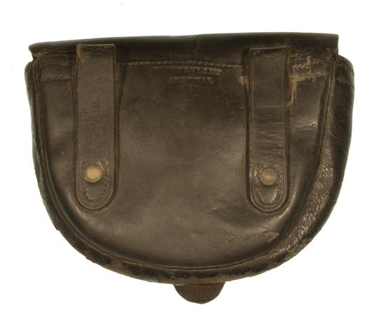 DYER POUCH, for 50/70 cartridges, Embossed US. Black leather with 2 belt loops. Common worm damage to inside of pouch. Lining is gone. All stitching is good and tight. Back marked Watervliet Arsenal. Some flaking to leather on bottom, Original.