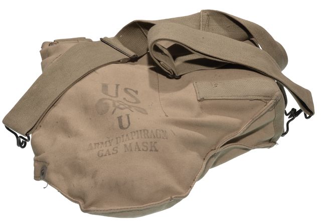 WORLD WAR II DIAPHRAM GAS MASK, With carrying case. Bag pouch stenciled US ARMY DIAPHRAM GAS MASK with chemical corps insignia. Appears complete, Original.