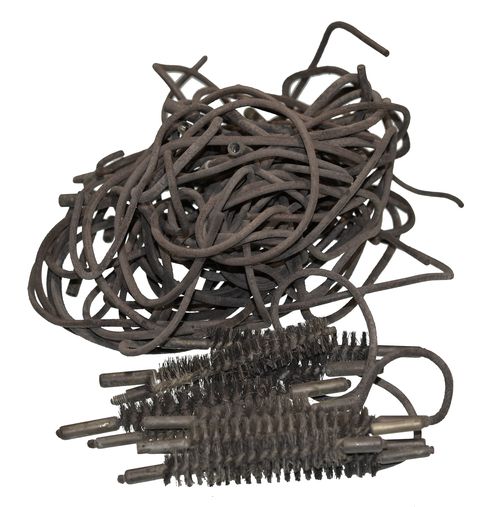 CIVIL WAR CARBINE CLEANING BRUSHES WITH PULL THRU THONGS, 10 assorted brushes with pull thru thongs (All detached). Extra thongs included, Original.