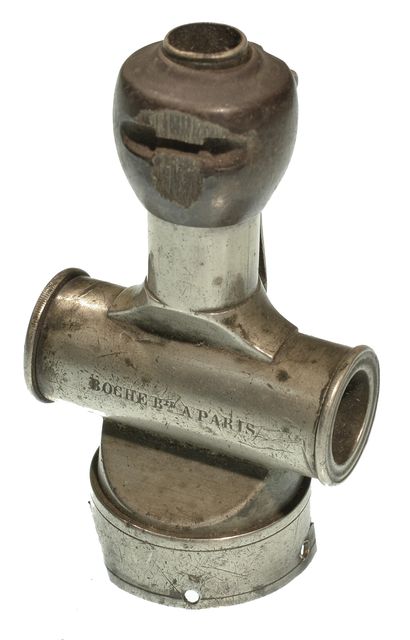 HIGH QUALITY POWDER MEASURE, French made, Marked "Boche Paris" Push dispenser that operates link to release charge. Powder charge can be viewed through sight glass. Adjustable cylinder(Frozen). Thin edge of nickel broken away at flask attachment point, Original.