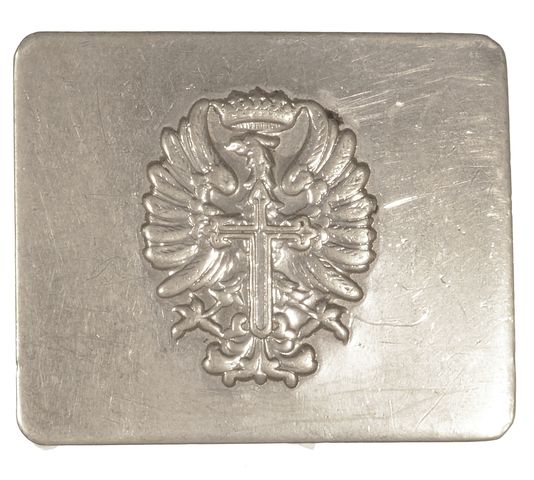 1936-1939 SPANISH CIVIL WAR BUCKLE, Nickel plated brass with belt attachment. Eagle wings are feathered and cross has straight body. 2" Tall x 2 1/4" wide. Back marked CERECDA, Original.
