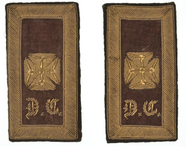 SHOULDER STRAPS, Fraternal Deputy Commander. Templar. Gold bullion on red velvet background. Approximately 2 1/4" x 4 1/8". Back marked "Harding Uniform & Regalia Co - 30 Franklin St, Boston". Harding was located at this address from 1925-1930. Excel