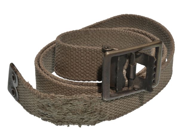 WORLD WAR I U.S. ARMY MILLS WAISTBELT, Khaki web with brass buckle and end. Marked “Pat Jan 12 ‘04” Approximately size 34. Period sewn repair, Original.