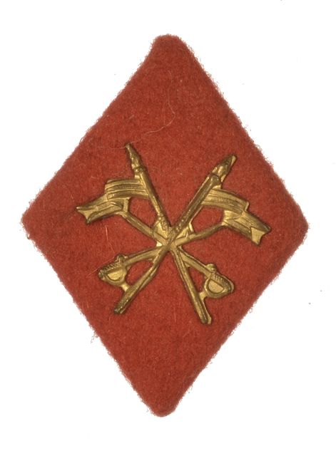 SPANISH ARMY COLLAR INSIGNIA, Cavalry, World War II thru Cold War Era. Red Cloth with Stamped Metal Insigina in Center, Original.