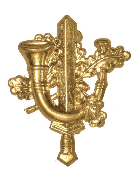 FOREIGN BRASS SWORD & HORN WITH LEAVES, 2" Tall, 2 loops on back, Original.