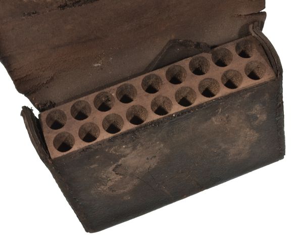 1870'S CARTRIDGE BOX, Militia or Military school conversion of a Civil War box. Wooden block with 18 holes for 45/70 rounds. Missing closure strap and stud. Two brass studs for cross strap. leather dry and worn, several seems open, Original.