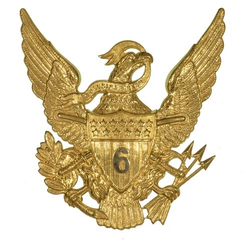 M1881 CAVALRY HELMET PLATE. Eagle, Shield and Crossed Sabers, With Number 6, Reproduction.